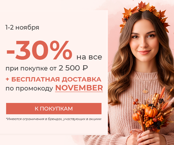 Скидка -30% от 2500 рублей на все + бесплатная доставка в подарок по промокоду NOVEMBER