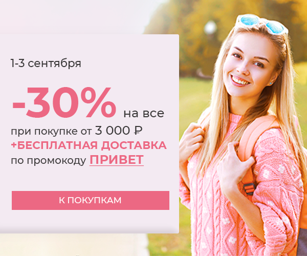 Скидка -30% от 3000 рублей на все + бесплатная доставка в подарок по промокоду ПРИВЕТ