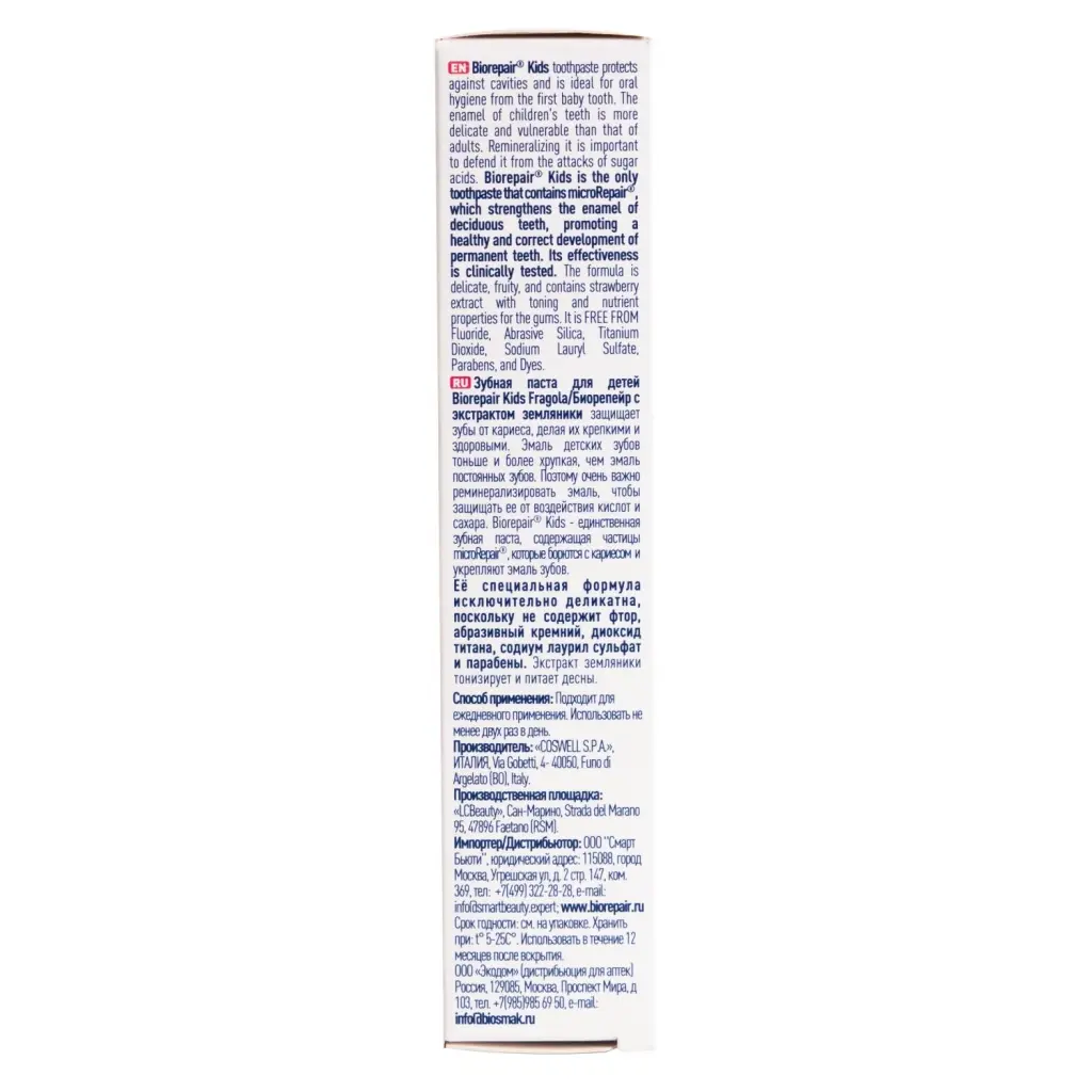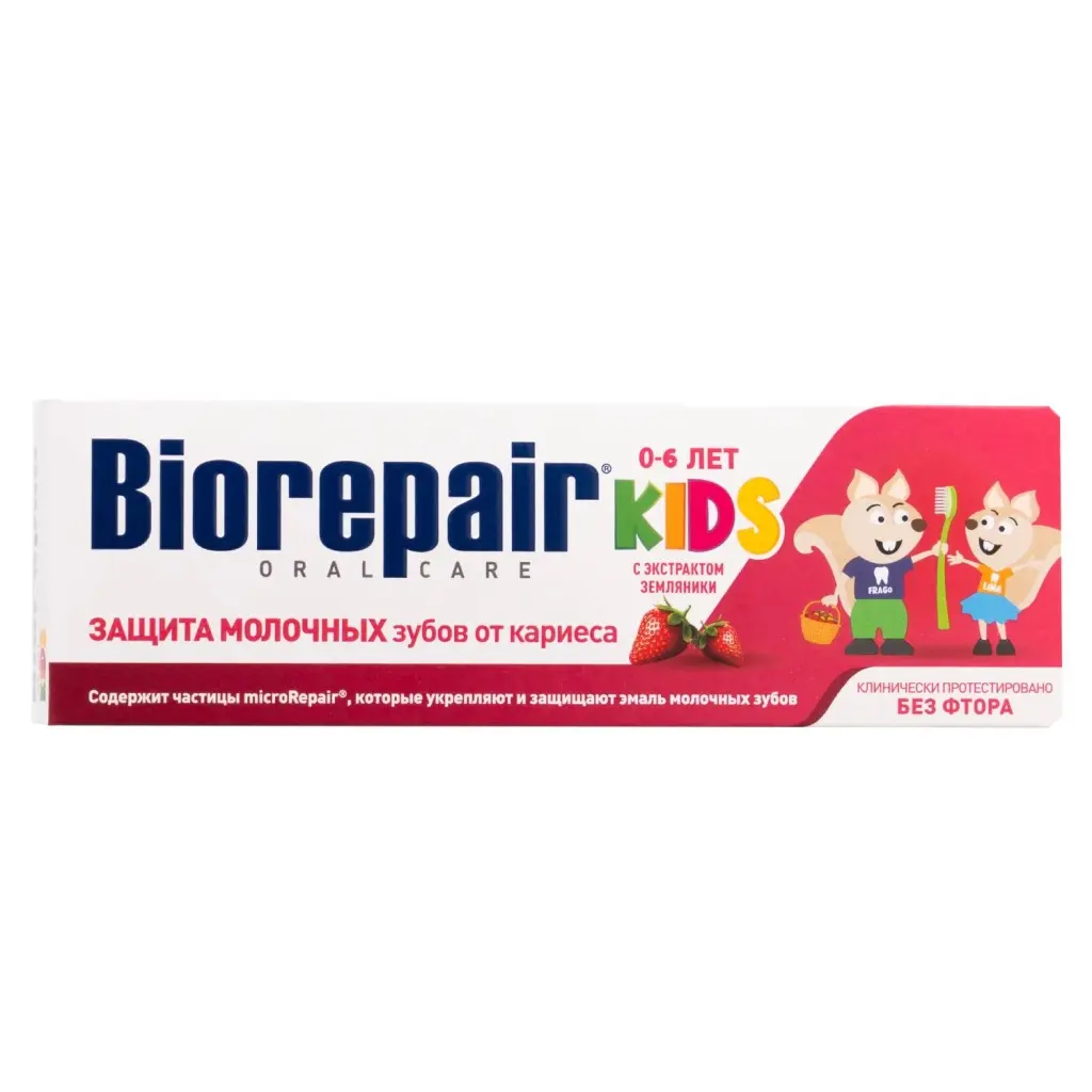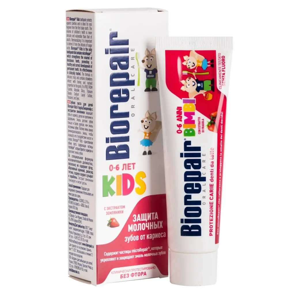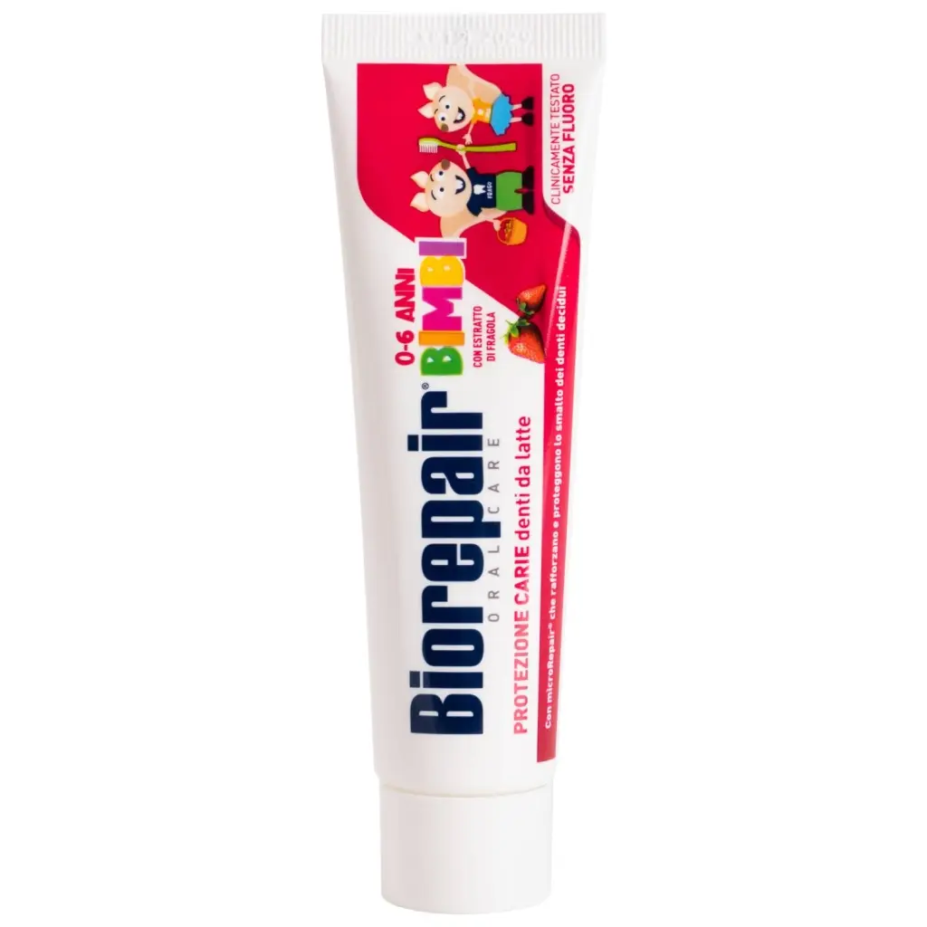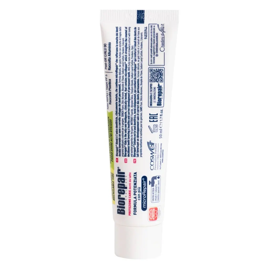 Biorepair®Kids – единственная зубная паста, содержащая частицы microRepair®, которые укрепляют эмаль молочных зубов, способствуя правильному развитию и здоровью постоянных зубов. Ее эффективность клинически протестирована. Исключительно деликатная формула Biorepair®Kids содержит экстракт земляники, который увлажняет и питает десны.