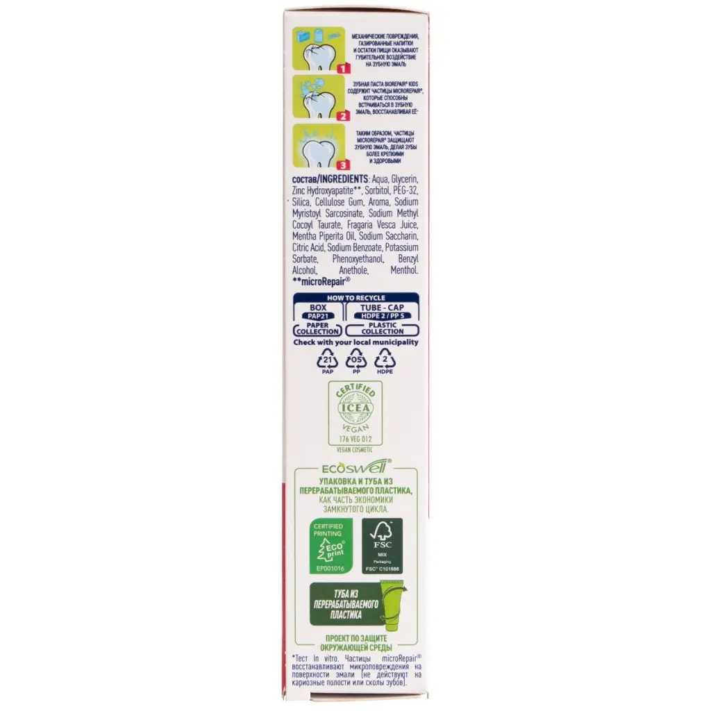 Укрепляет детскую эмаль и борется с меловидными пятнами на молочных зубах благодаря частицам microRepair®. Их состав идентичен природному гидроксиапатиту, из которого состоят эмаль и дентин. Благодаря своей игольчатой структуре microRepair® встраиваются в зубную эмаль, заполняя микротрещины, восстанавливают ее и делают гладкой, оказывают антибактериальное воздействие благодаря ионам цинка.