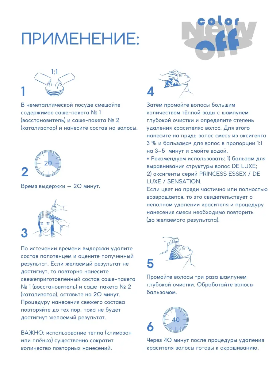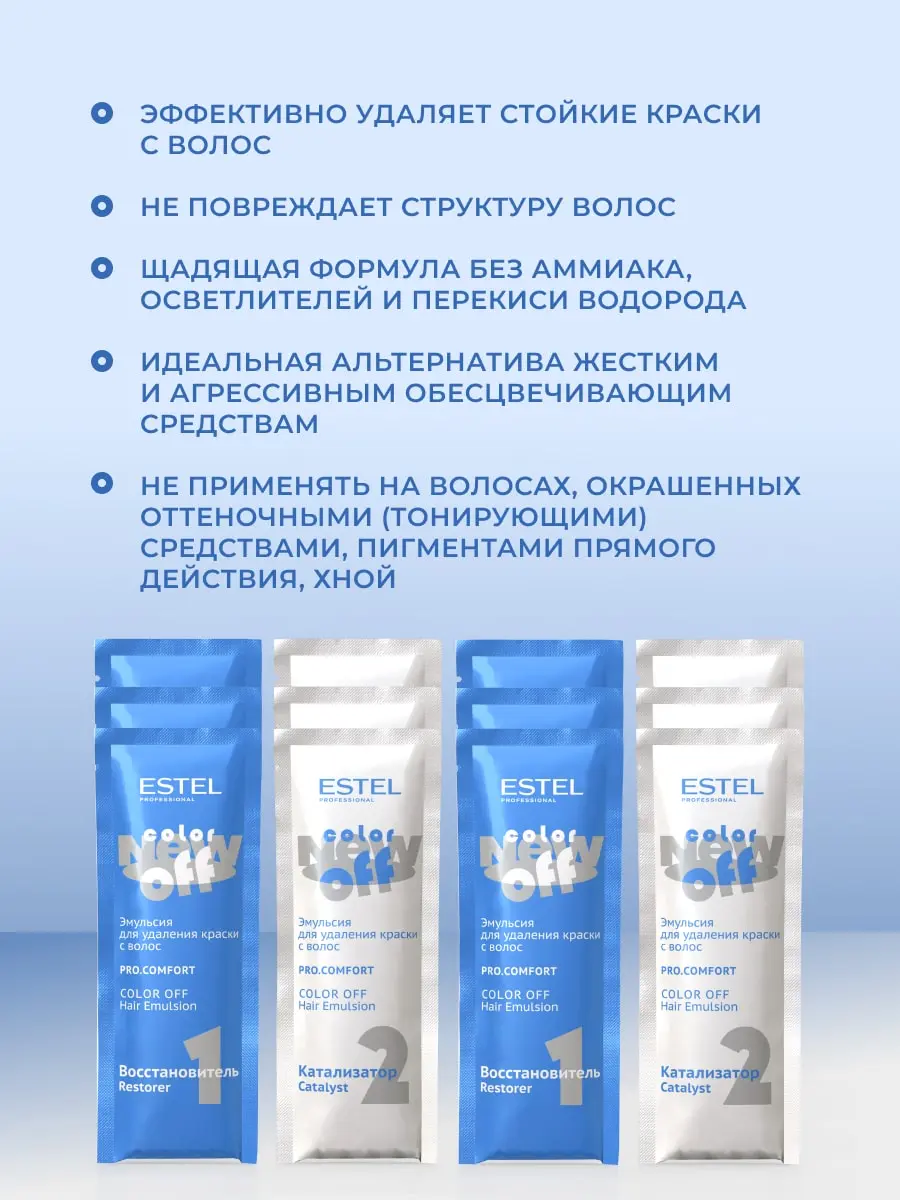 Эмульсия для удаления краски с волос Color Off в новом формате. Удобная упаковка с готовой пропорцией восстановителя и катализатора 1:1 — идеальная точность без дополнительного взвешивания. Щадящая формула позволяет эффективно удалять стойкие краски с волос, не повреждая их структуру. Идеальная альтернатива жёстким и агрессивным обесцвечивающим средствам.