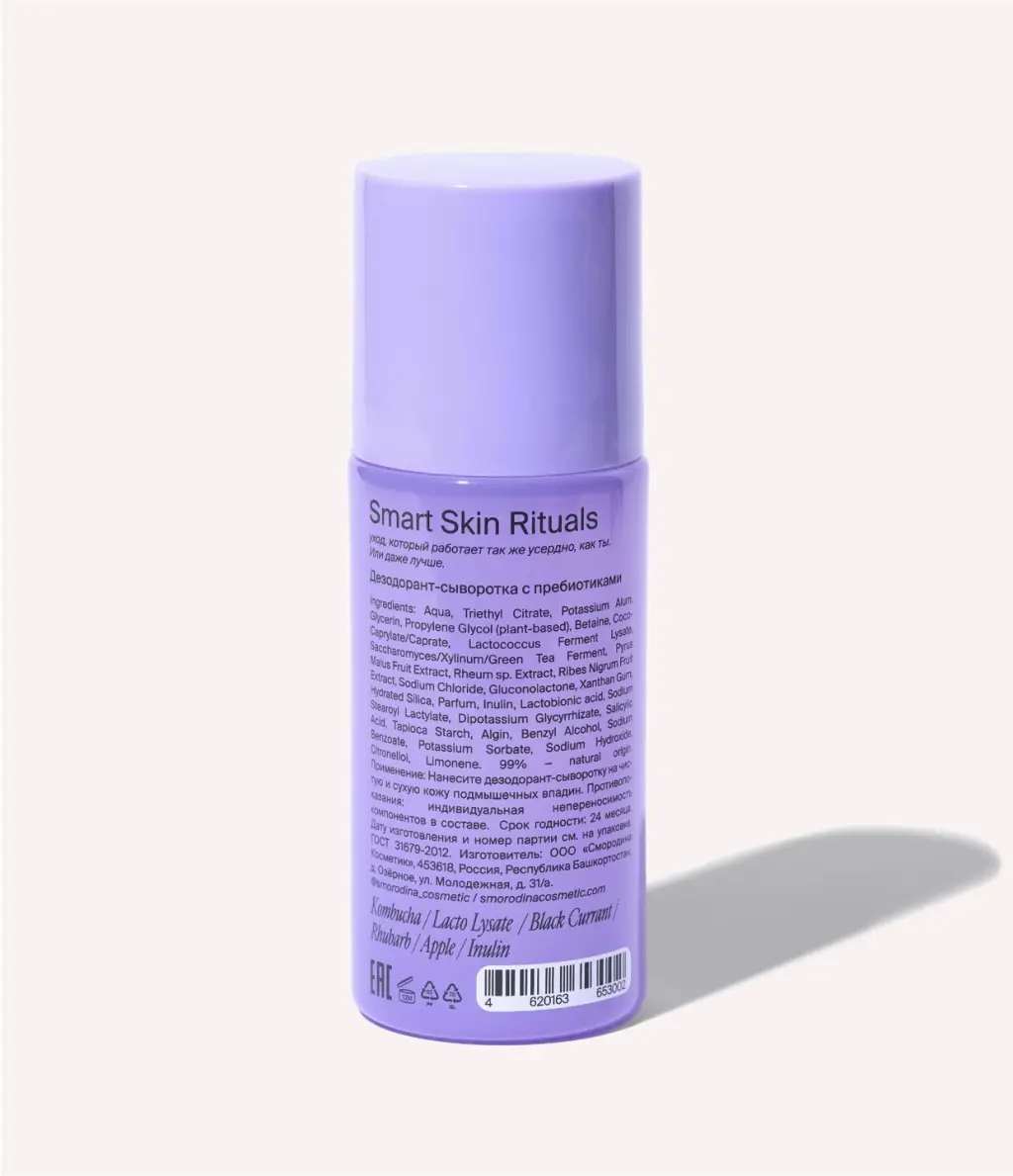 Натуральный дезодорант нового поколения, который не просто нейтрализует запах, а заботится о здоровье кожи. Пребиотики и пробиотики поддерживают баланс микробиома - усиливают рост полезных бактерий и подавляют активность тех, что вызывают неприятный запах.