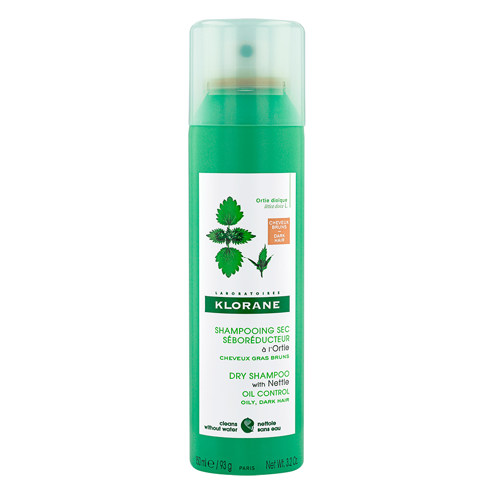 Сухой шампунь Klorane с экстрактом крапивы помогает сохранять чистоту жирных волос в промежутках между мытьем.