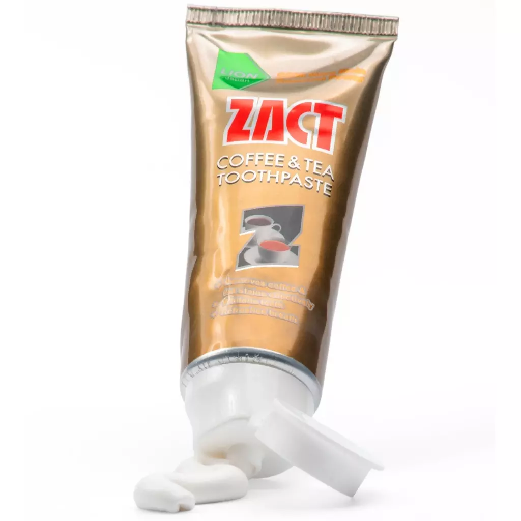 Отбеливающая зубная паста Lion Zact Coffee & Tea Toothpaste бережно удаляет чайный и кофейный налет, потемнения с поверхности зубов. При ежедневном использовании паста препятствует появлению налета от сока, фруктов, вина, шоколада, кофе и табака. Паста делает зубы белее, а дыхание более свежим.