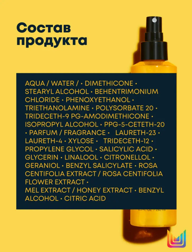 Состав: aqua / water, dimethicone, stearyl alcohol, behentrimonium chloride, phenoxyethanol, triethanolamine, polysorbate 20, trideceth-9 pg-amodimethicone, isopropyl alcohol, ppg-5-ceteth-20, parfum / fragrance, laureth-23, laureth-4, xylose, trideceth-12, propylene glycol, salicylic acid, glycerin, linalool, citronellol, geraniol, benzyl salicylate, rosa centifolia extract / rosa centifolia flower extract, mel extract / honey extract, benzyl alcohol, citric acid.