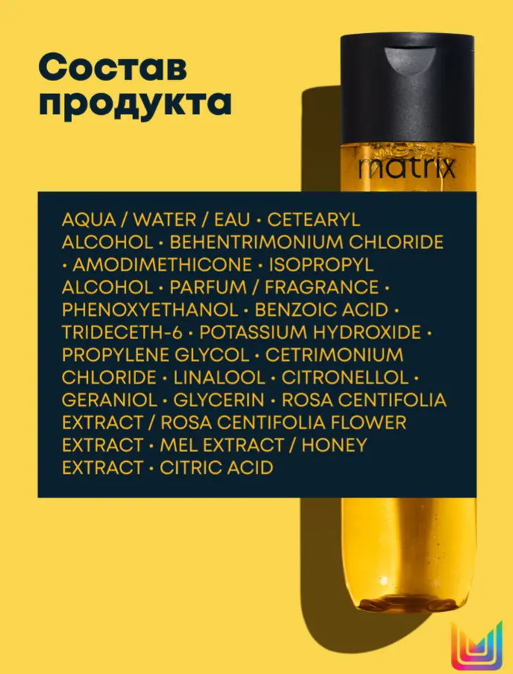 Состав: aqua / water / eau, cetearyl alcohol, behentrimonium chloride, amodimethicone, isopropyl alcohol, parfum / fragrance, phenoxyethanol, benzoic acid, trideceth-6, potassium hydroxide, propylene glycol, cetrimonium chloride, linalool, citronellol, geraniol, glycerin, rosa centifolia extract / rosa centifolia flower extract, mel extract / honey extract, citric acid.