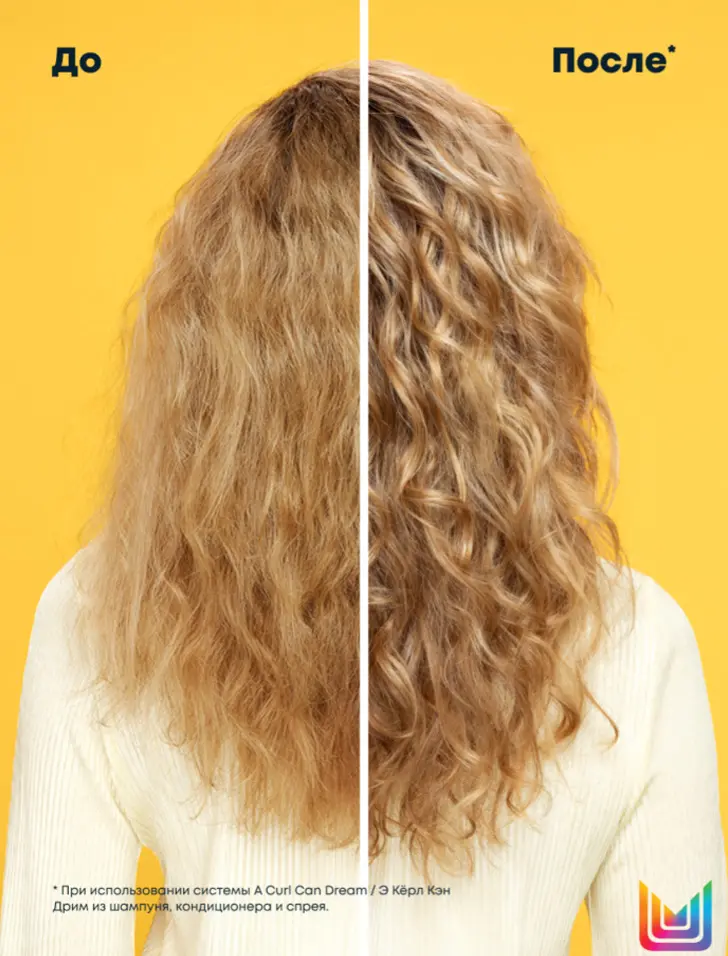 *Потребительский тест, 57 участников, при использовании невесомого увлажняющего шампуня, невесомого увлажняющего кондиционера и дефинирующего спрея A Curl Can Dream.