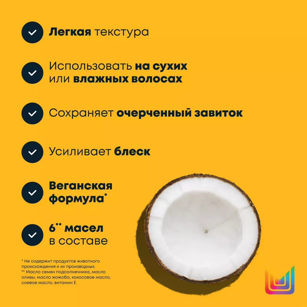 Масло отлично подходит для завершения укладки, очерчивает кудри и завитки, а также усиливает блеск. Питает кудри без утяжеления и придает гладкость. Восстанавливает упругость и жизненную силу волос.
