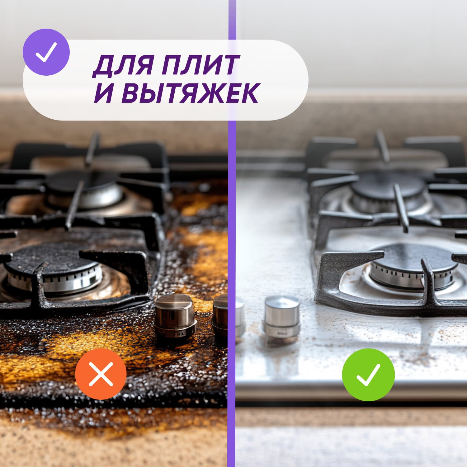 Эффективное средство для удаления подгоревших жиров, масел, стойких пищевых загрязнений с поверхностей - стеклокерамических плит, духовок, гриля, вытяжек, нержавеющей стали, кафеля, пластика, сковород, кастрюль, микроволновых печей. Не содержит хлора, фосфатов, красителей.
