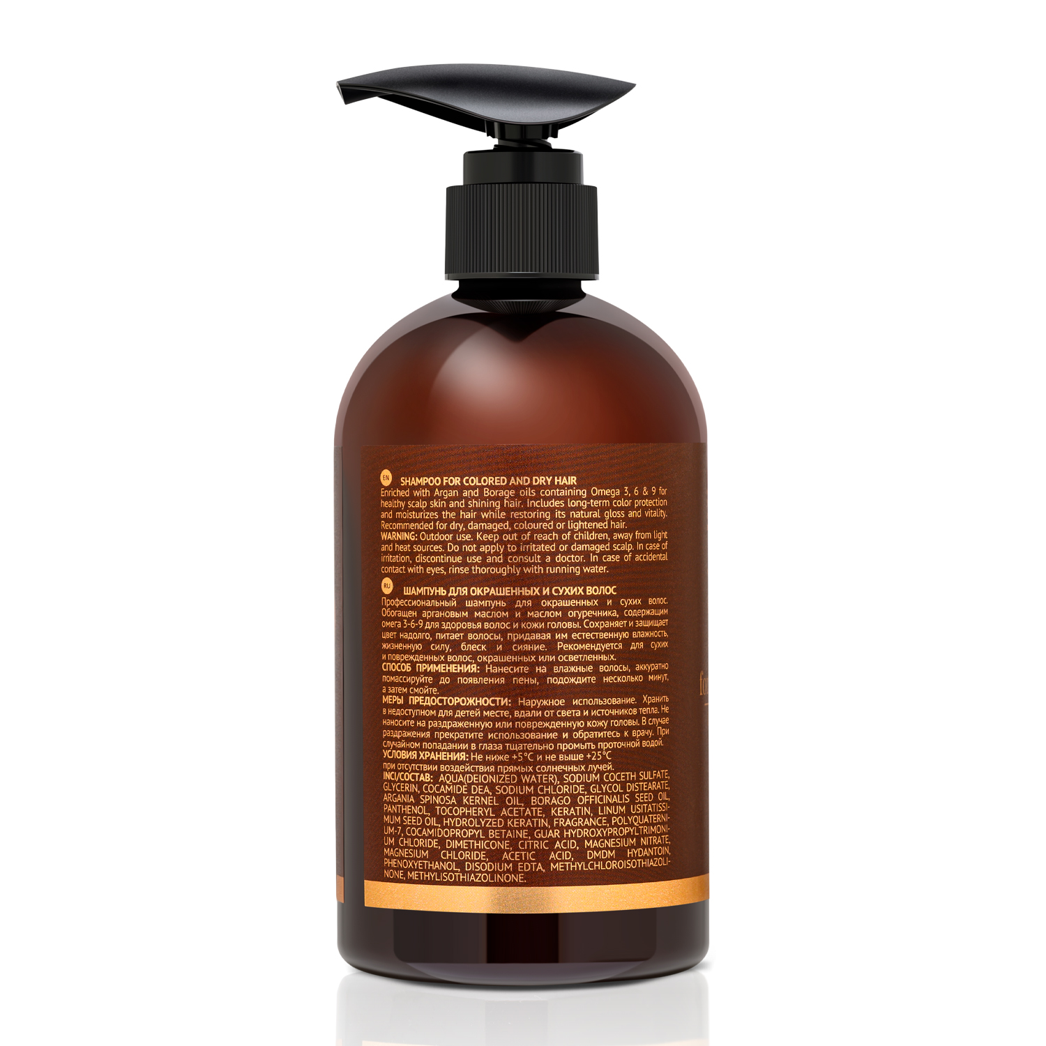 Профессиональный шампунь для окрашенных и сухих волос обогащен аргановым маслом и маслом огуречника, содержащим омега 3-6-9 для здоровья волос и кожи головы. Сохраняет и защищает цвет надолго, питает волосы, придавая им естественную влажность, жизненную силу, блеск и сияние.
