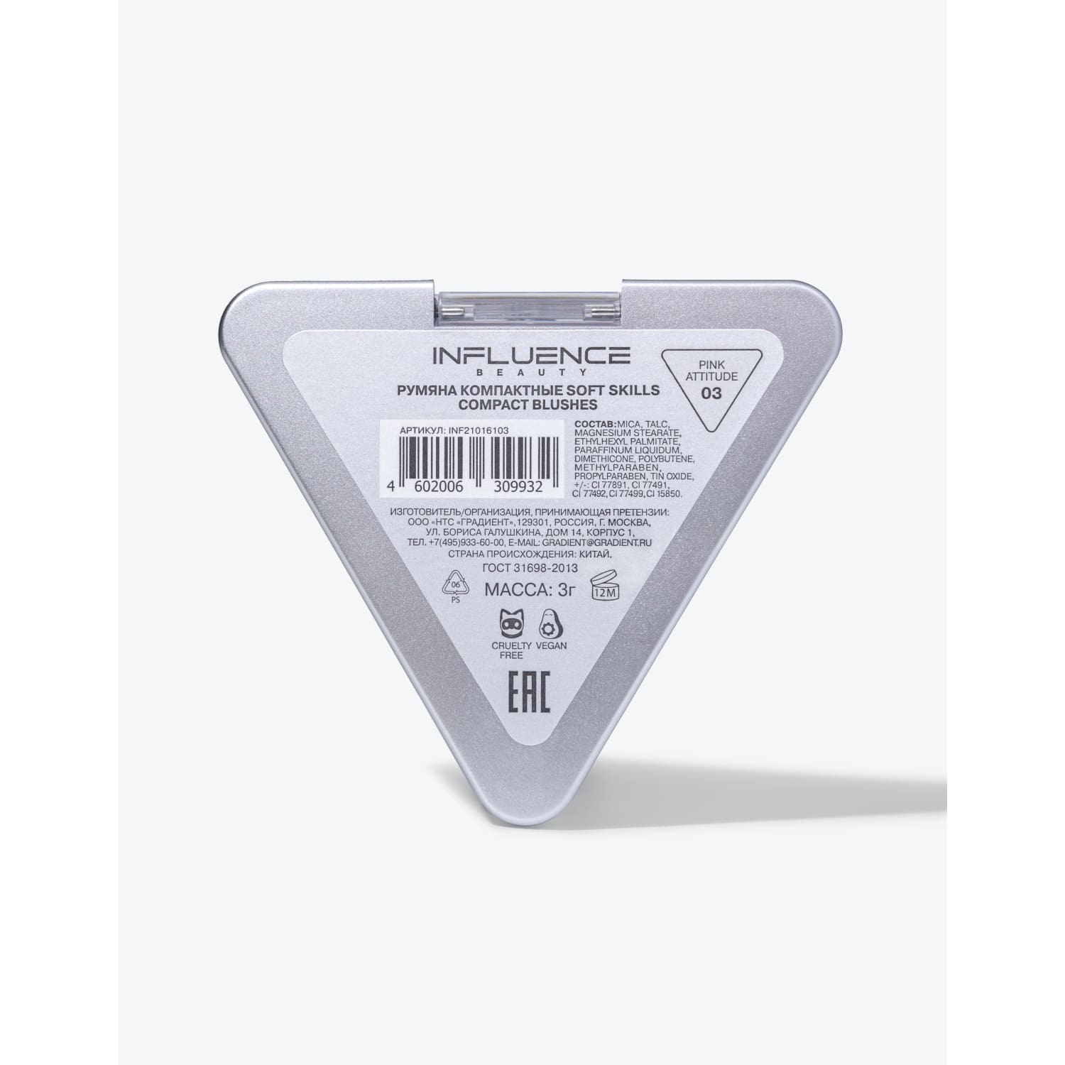 Благодаря технологии Adaptskill румяна Soft Skills от Influence Beauty адаптируются к поверхности кожи, не подчеркивая ее рельеф. Они легко наносятся, растушевываются и распределяются как поверх тональной основы, так и поверх пудры. Нестандартная упаковка треугольной формы и минималистичный дизайн дополняют футуристичный характер продукта.