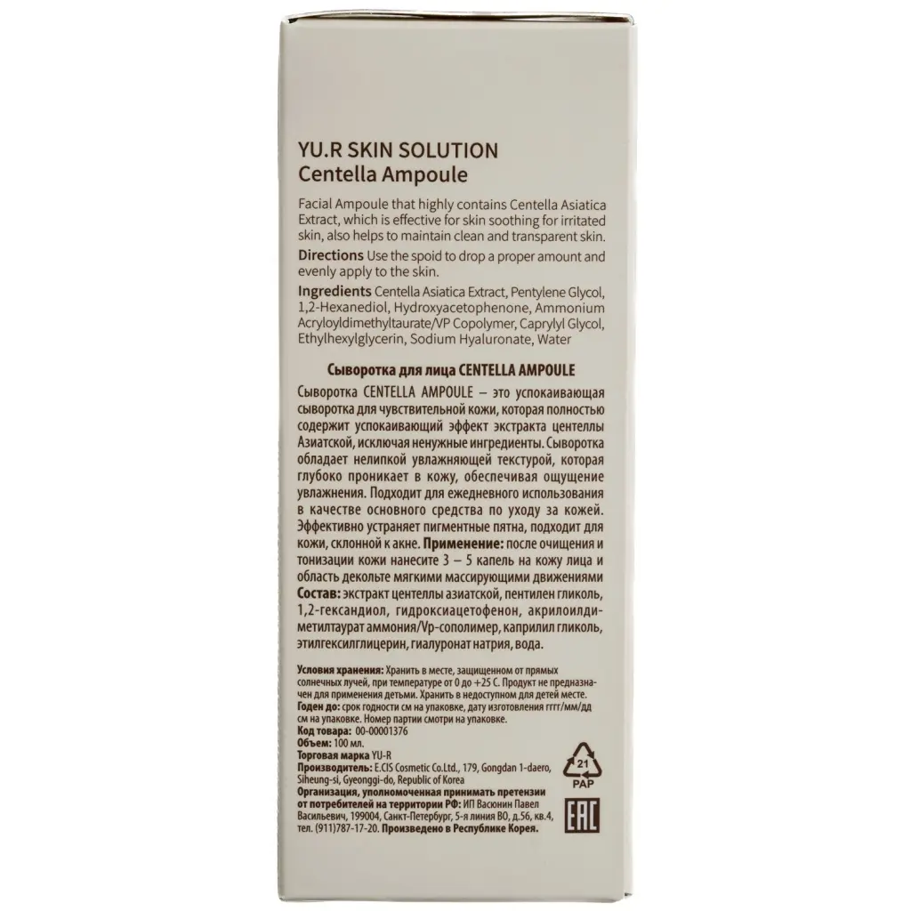 Успокаивающая сыворотка для чувствительной кожи содержит максимальную концентрацию высокорегенерирующего экстракта центеллы азиатской (91,3%) с легкоусвояемой формулой ускоренного действия.